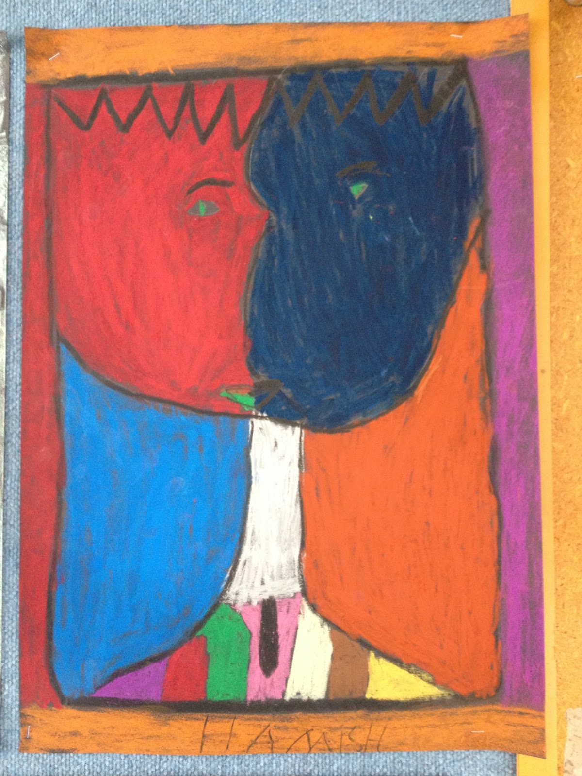 Students were encouraged to experiment with patterned elements, as Picasso had done in some of his works of art. The aim was to be able to see both front on and profile views in each portrait.